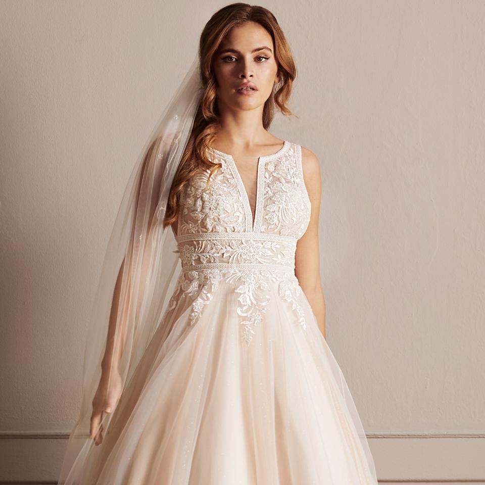 Förtjusande blomsterbroderier och uttrycksfull spets smidigt sammanflätas över tyll, glittrande tyll eller satin och skapar extravagant visuell skönhet full av elegans.