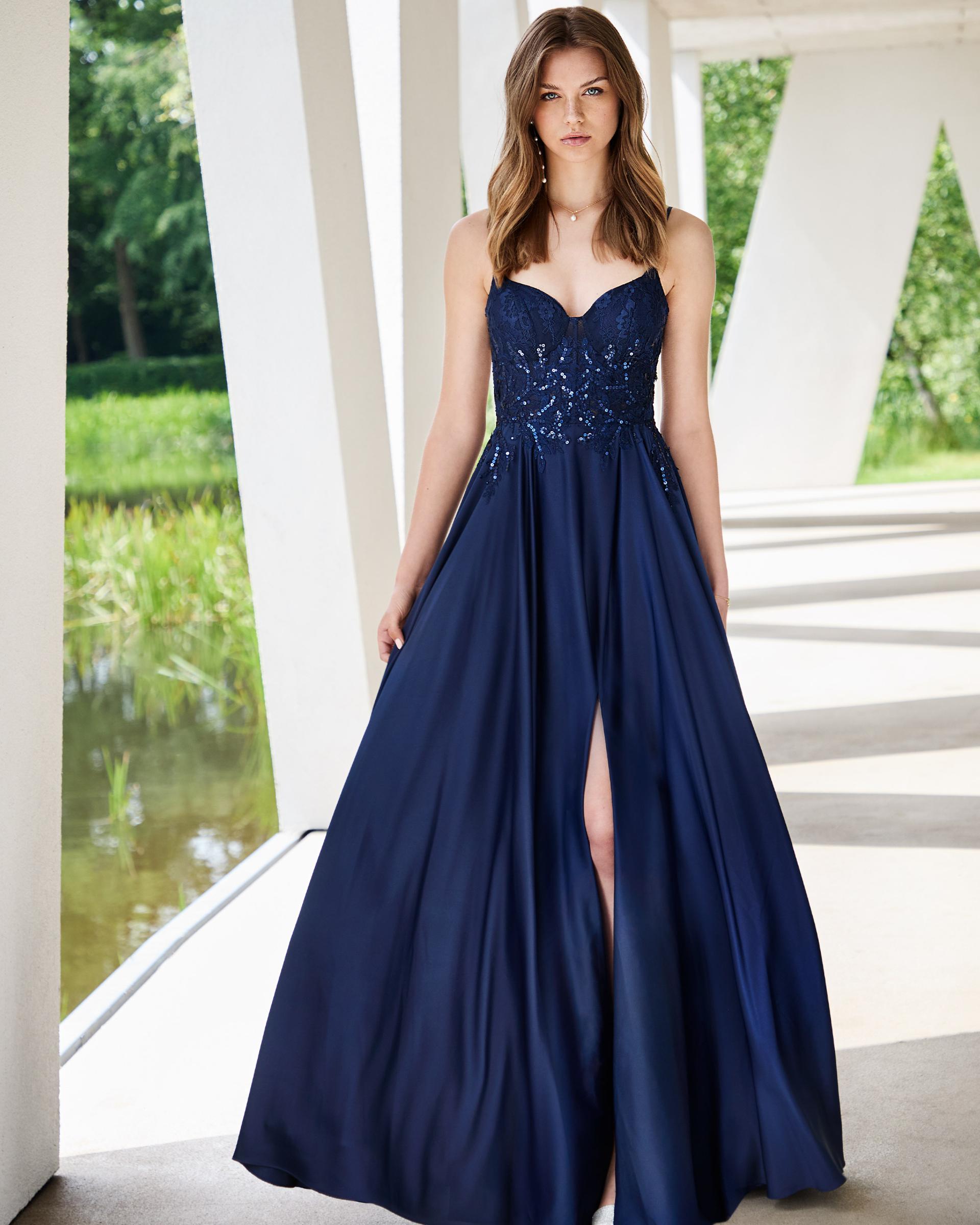 Mörkblå cocktailklänning med spetsliv och chiffong A-linje nederdel