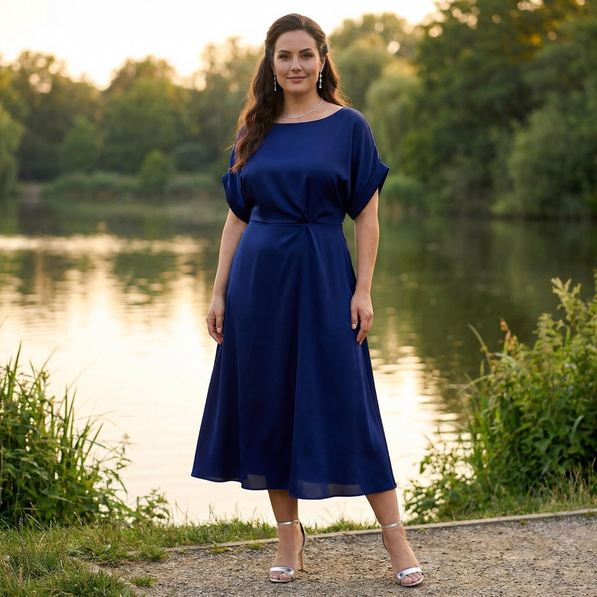 Lilly Satin V-ringad Klänning med Capeärm (djupblå)